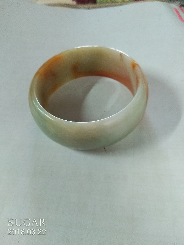 看清了,是翡翠。但种质较粗,我不愿用种嫩种老来称呼,几乎没有什么水头。宽扁条手镯,圈口不大,红翡增色 ...